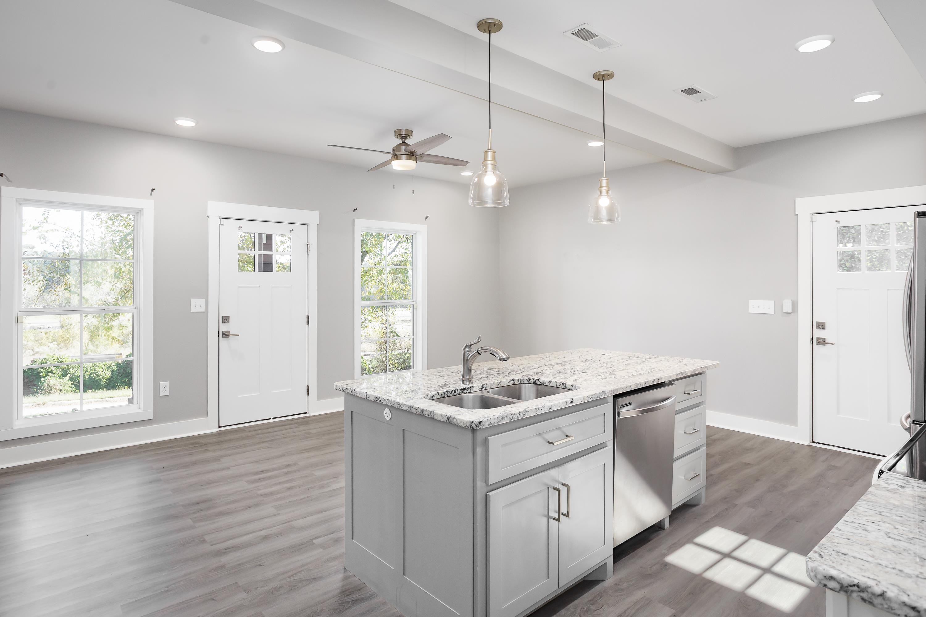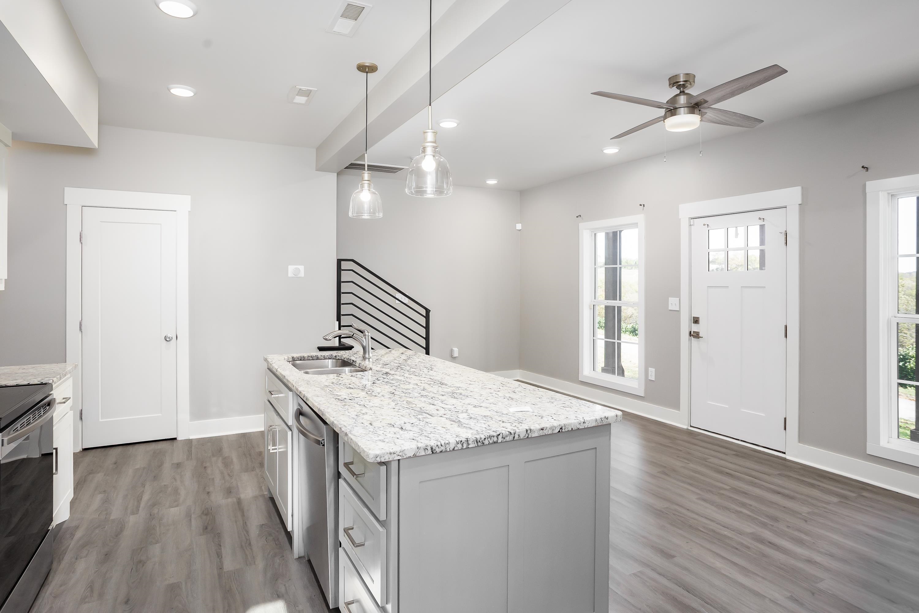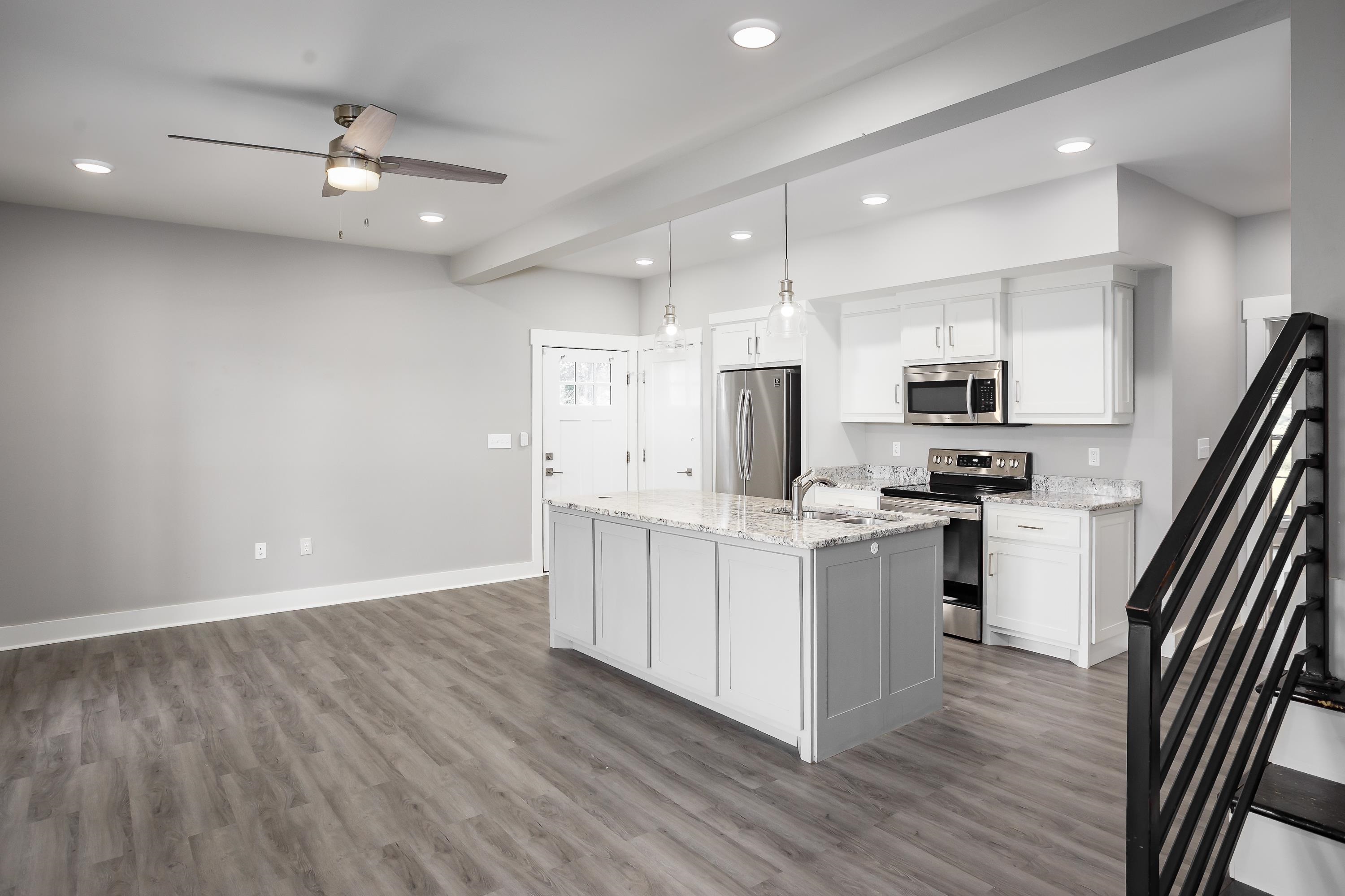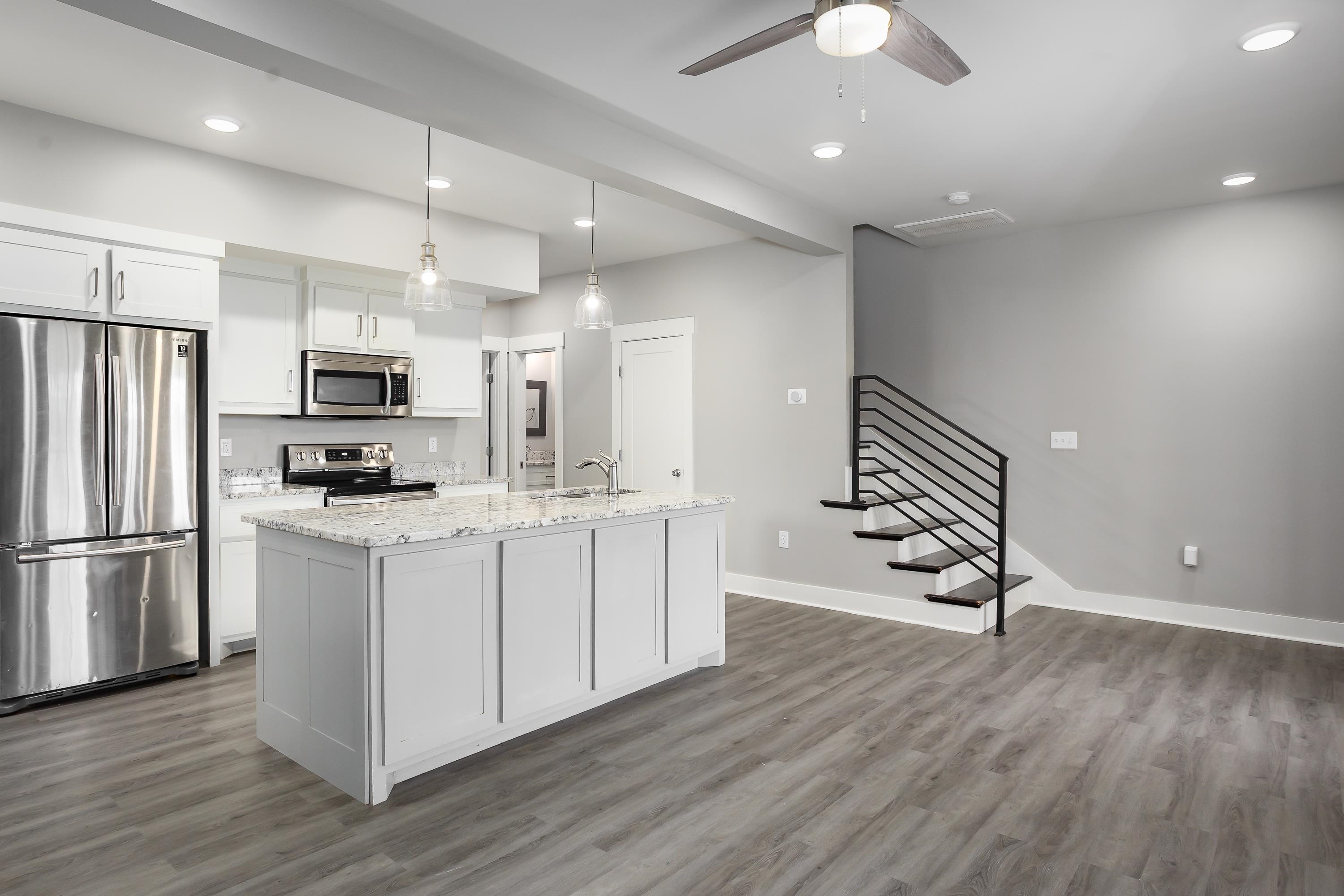 Welcome to 213 Virginia Ave, a modern farmhouse in the heart of Florence. This 3 bedroom, 2.5 bath home features clean, contemporary design and a bright open-concept layout. The main level offers a spacious living area and a stylish kitchen with granite countertops, stainless steel appliances, beautiful cabinetry, and a large island perfect for gathering. The primary suite is conveniently located on the main floor, offering privacy and comfort with an en-suite bath and walk-in closet. Luxury plank flooring flows throughout the main level, and the modern staircase adds a sleek architectural touch. Upstairs are two additional bedrooms and a full bath, ideal for family, guests, or a home office. The exterior showcases bright brick, black accents, and a covered front porch with timeless curb appeal. Located just minutes from downtown Florence, UNA, parks, and local dining. Move-in ready and easy to love—schedule your showing today!