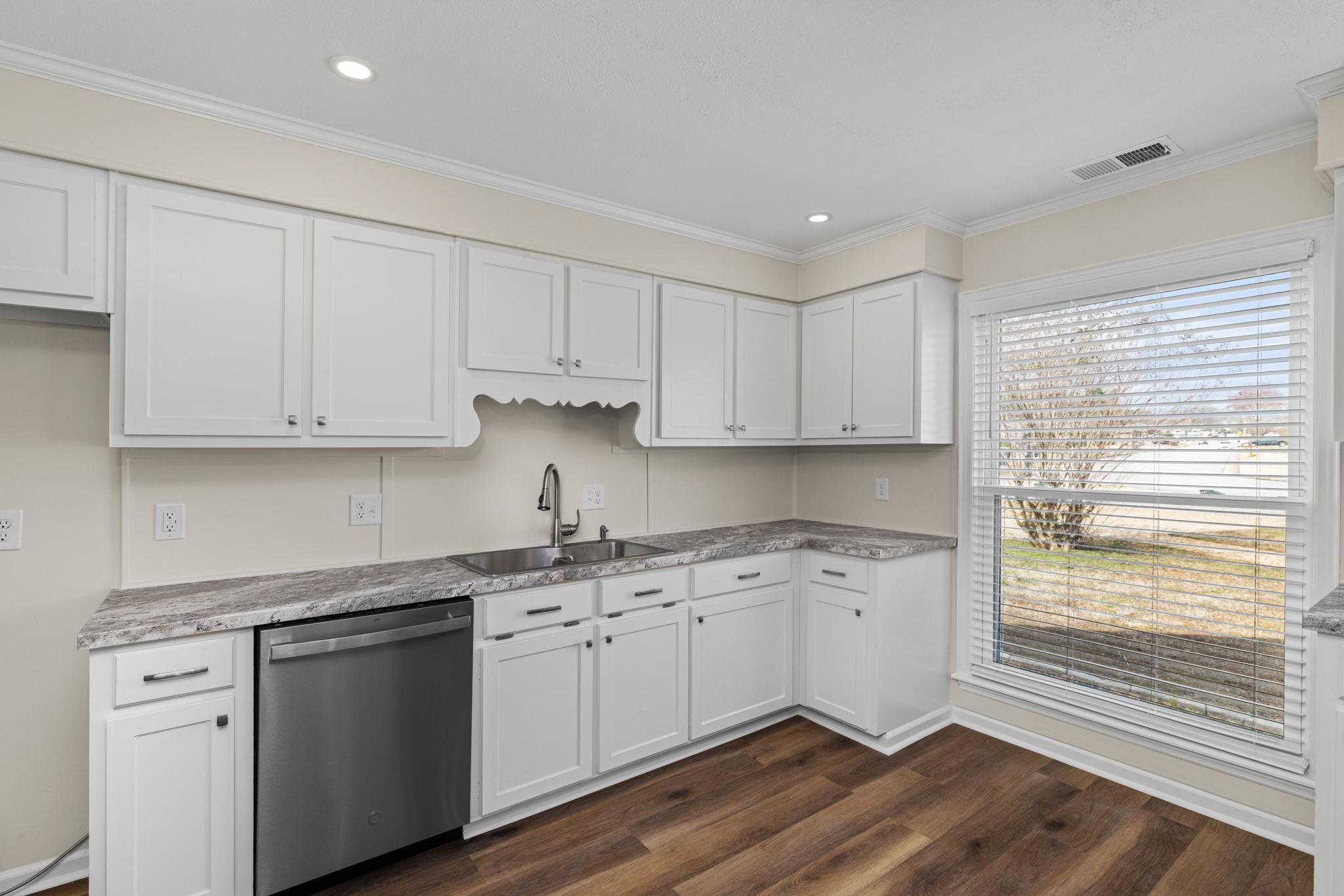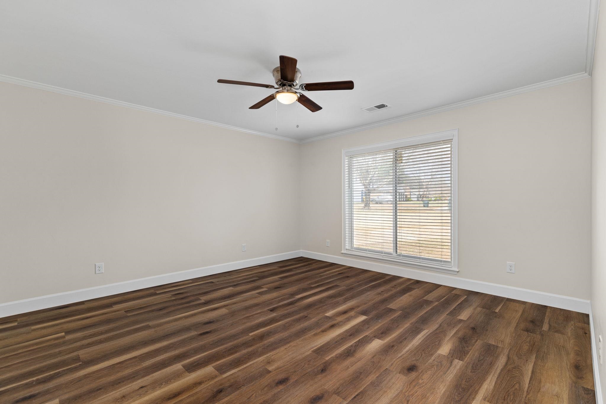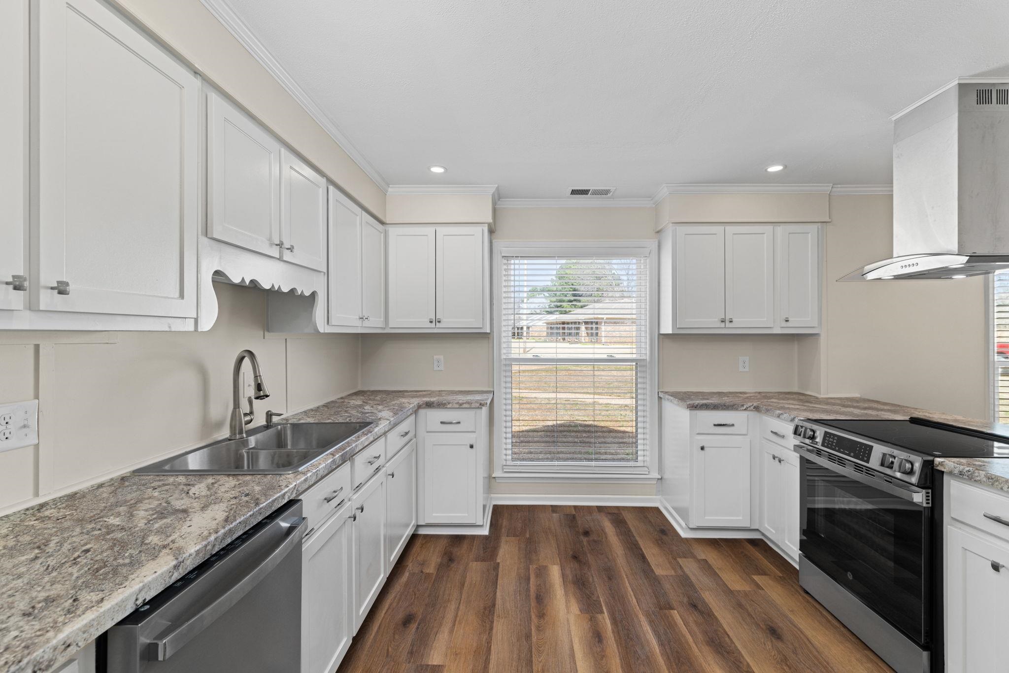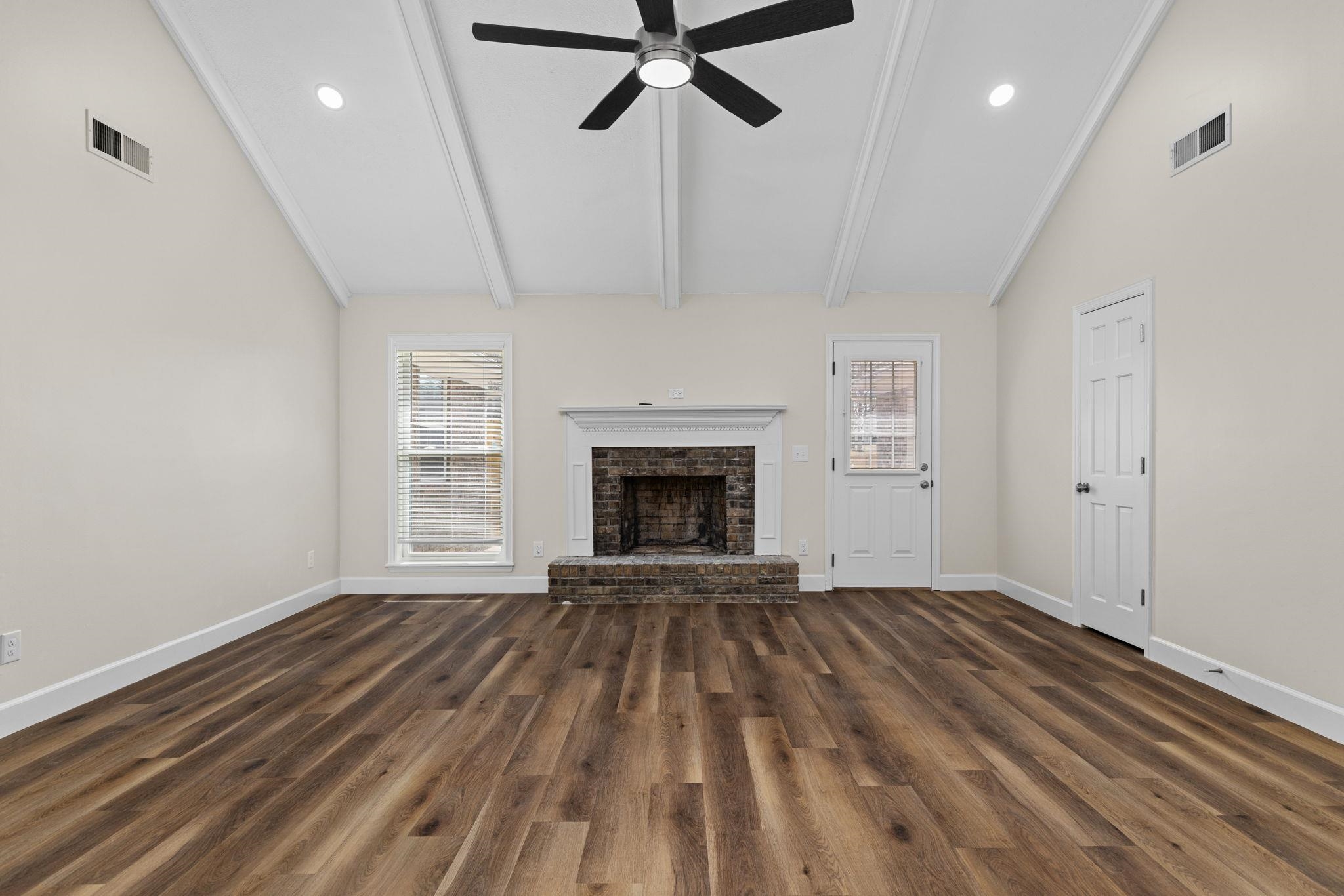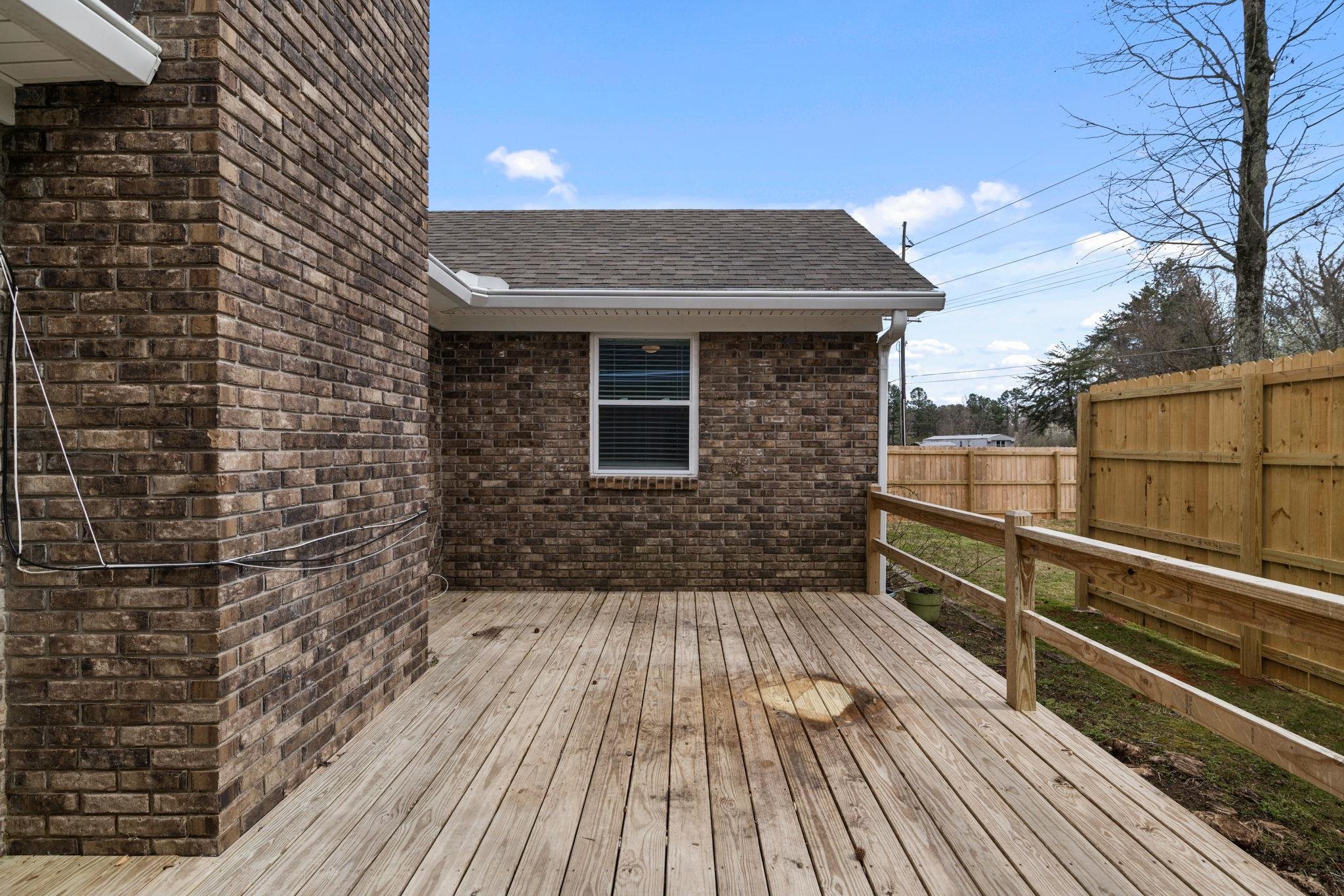 Don't wait! This 4 BR, 2 BA home won't last! Features include approx 1,834 sq ft., spacious single-level floor plan, living room w/ vaulted ceilings & exposed beams, recessed lighting, fireplace, kitchen w/ ample cabinetry, stainless appliances, good counter space, and a functional layout that flows into the dining area. Additional features include updated flooring, neutral paint colors, crown molding, and lots of natural light. The primary suite is generously sized and includes an updated bath with a double vanity and updated finishes. Three additional bedrooms provide space for family, guests, or a home office. Outside, you'll find a huge privacy-fenced backyard with mature trees, a spacious deck for entertaining or relaxing, and a storage building for additional space. Two-car attached garage with a great storage room.
