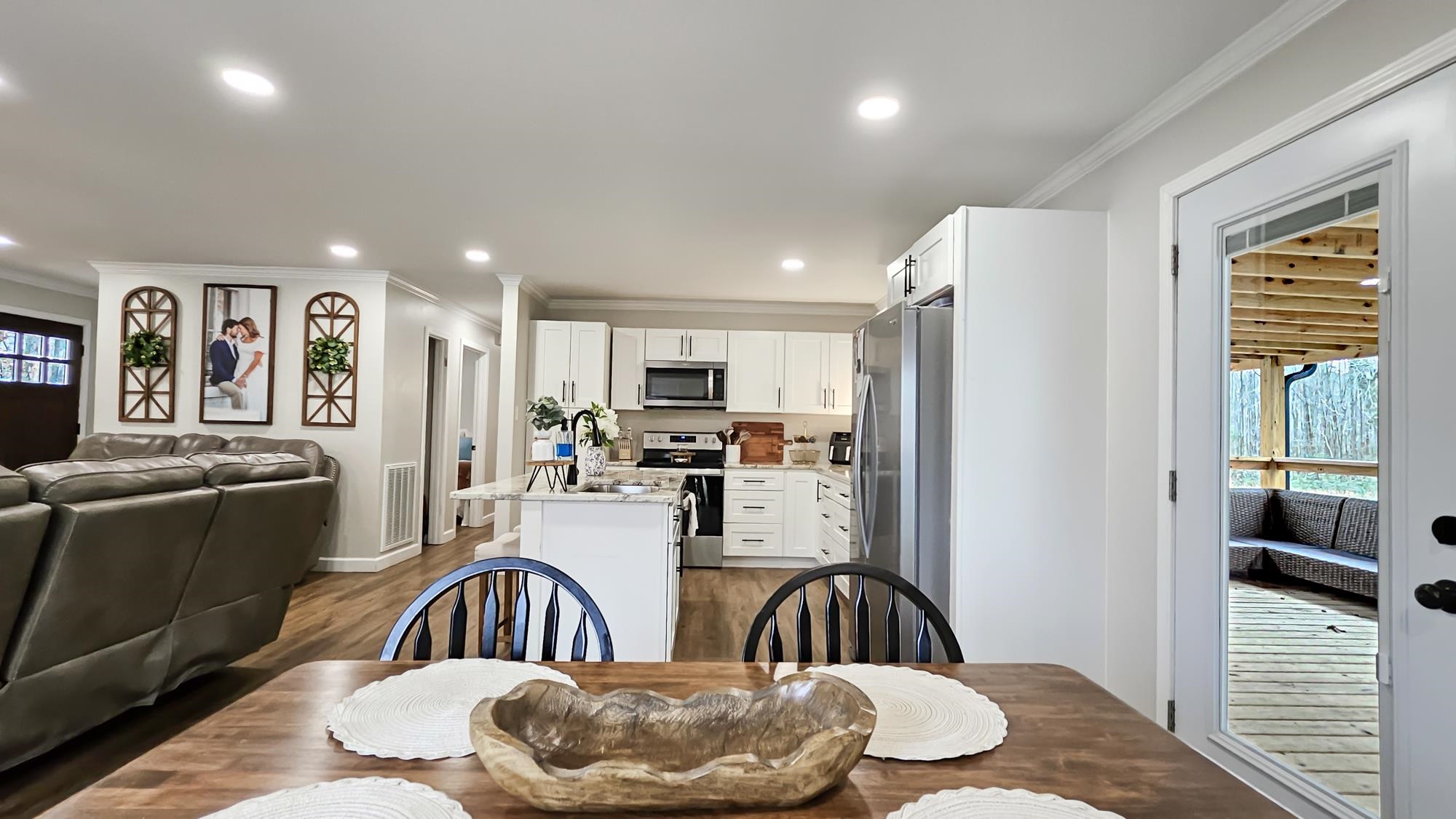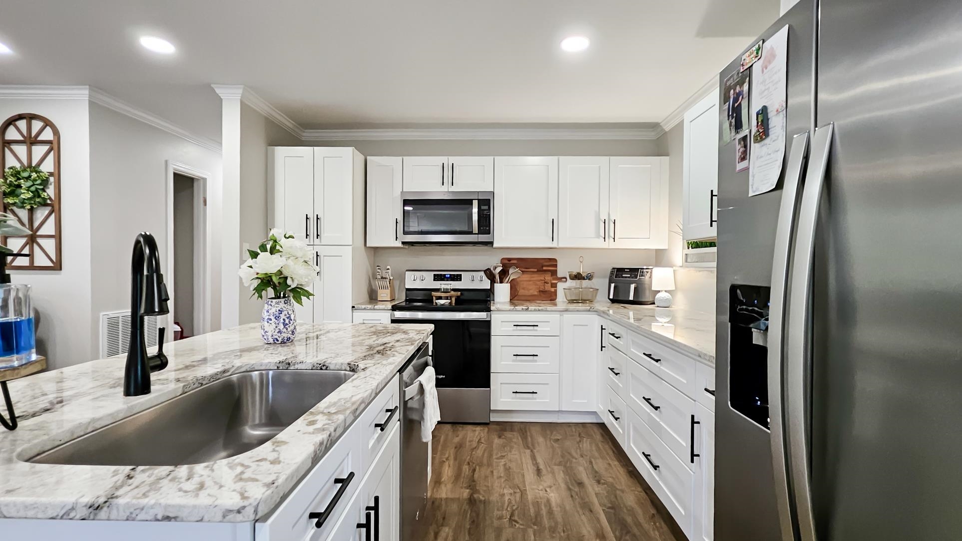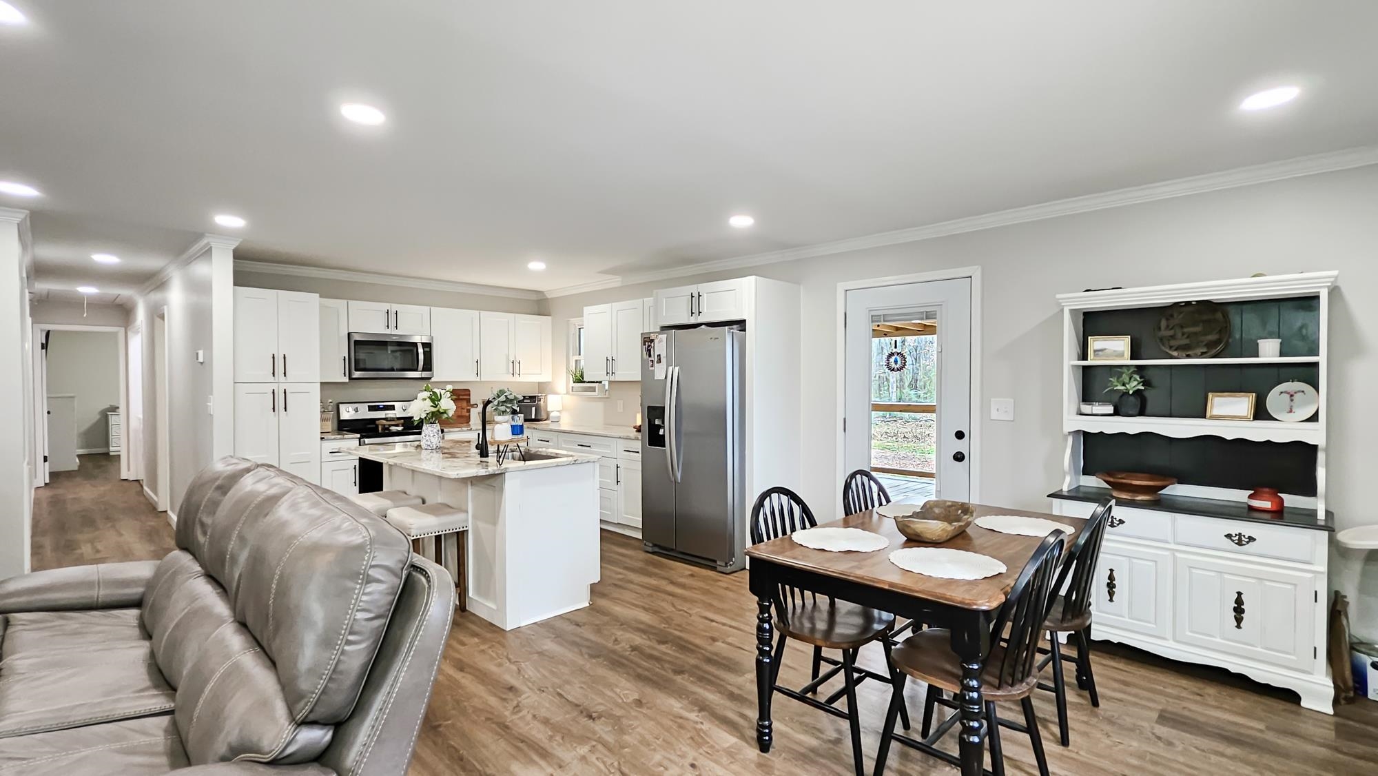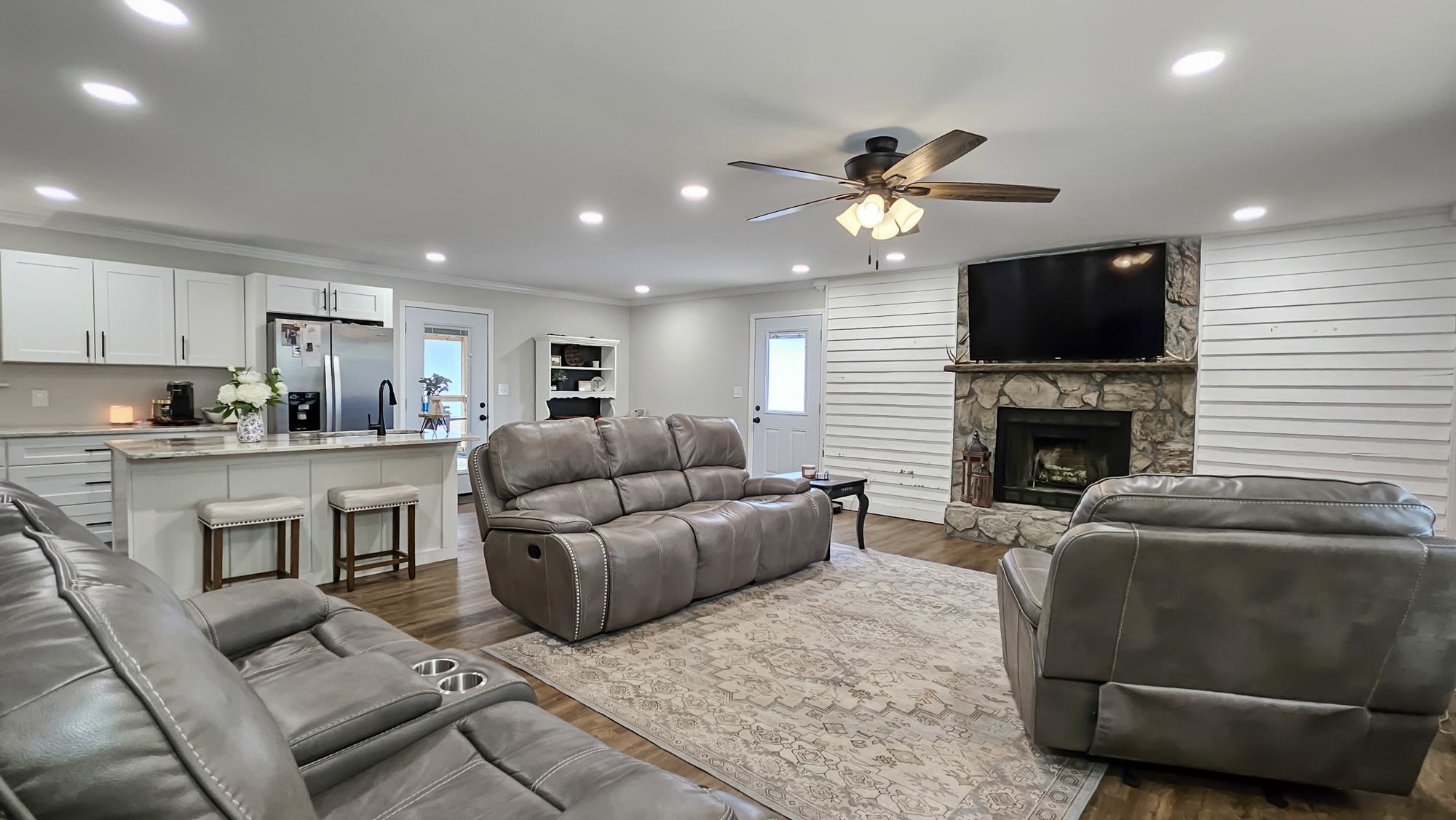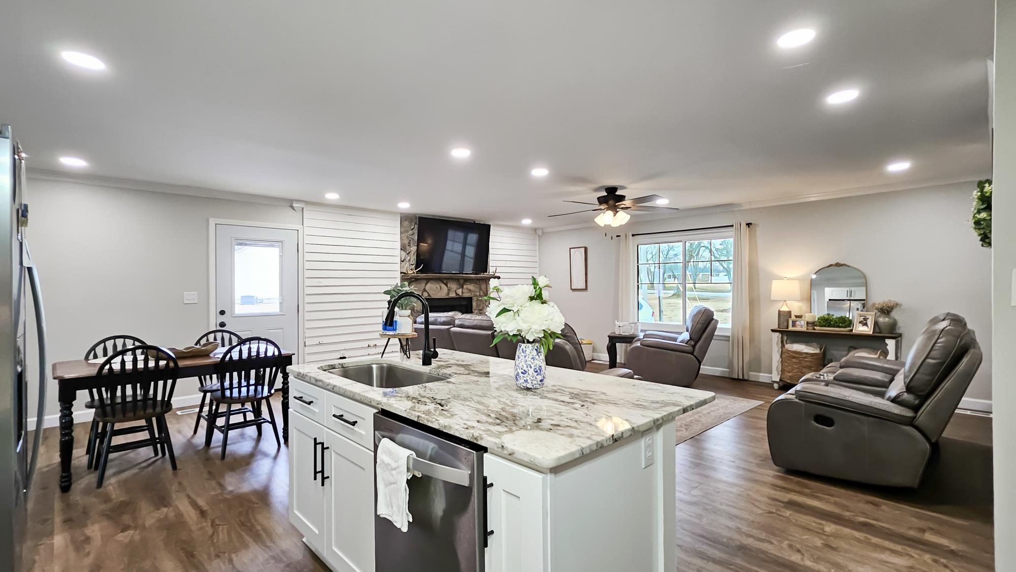 This perfect mid-size family home is ready to be yours. It offers a newly remodeled look, with a beautiful stone wood burning fireplace in the family room. A spacious layout with a private primary suite with his and hers closets and vanities, and a spacious walk-in tile shower. Great sized bedrooms with their own walk-in closets. The open layout in the living, dining and kitchen areas makes for a breathable spacious feel. The kitchen offers beautiful marble countertops, island and plenty of cabinet space. With its recent updates this home also offers newly installed front and back porch areas, new luxury vinyl flooring, a replaced roof, replaced windows, and recently replaced HVAC unit. The property also offers a spacious 24x30 shop with lean to attached. It also offers a perfect corner lot with privacy, its flat and spacious making it perfect for outdoor activities. Call today for more info or a private tour.