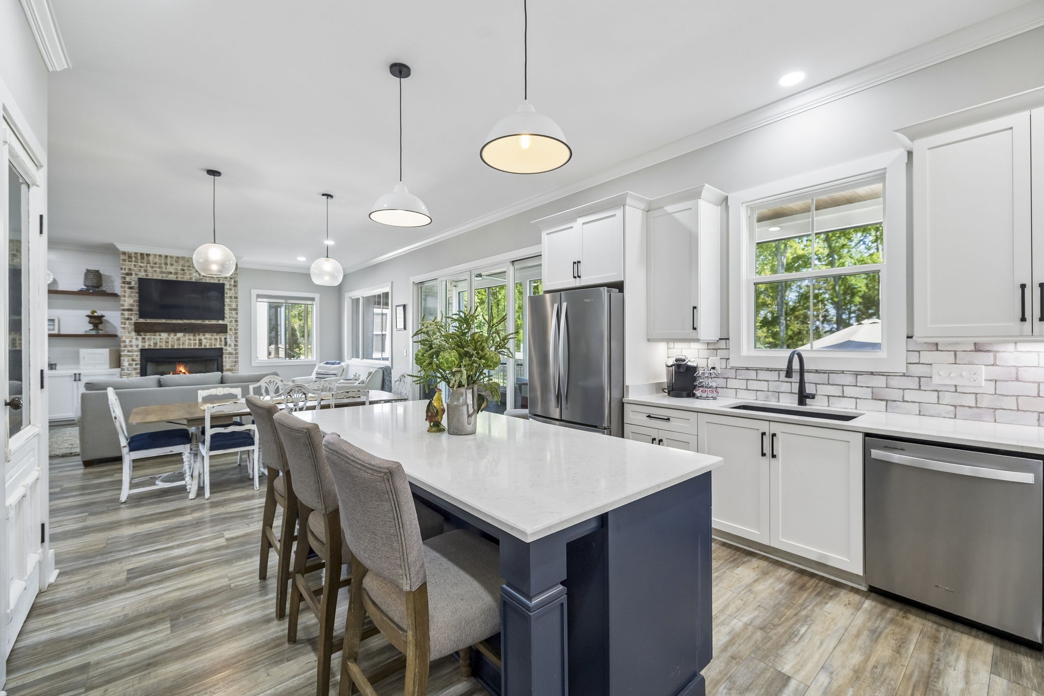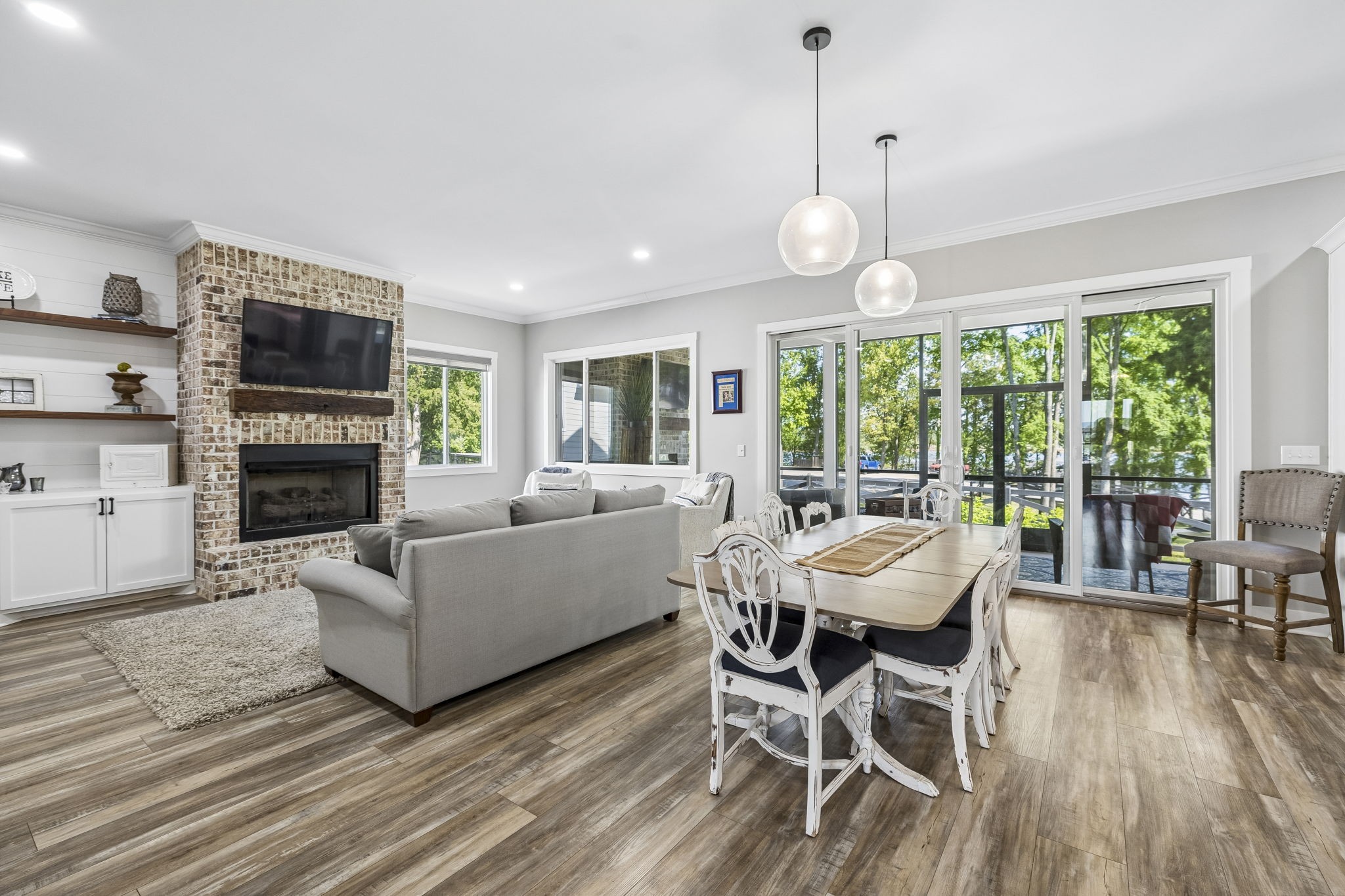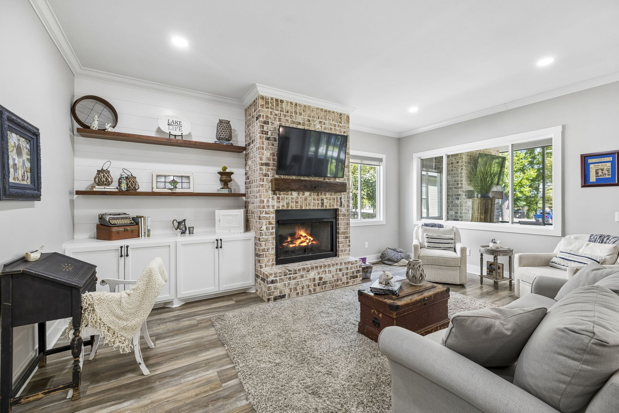 This stunning four bedroom 3.5 bath lake-area home is truly calling your name. Upstairs featuring 3 bedrooms, 2 bathrooms, a spacious bonus room perfect for a ping pong or pool table, plus a dedicated office or craft room, this home offers both comfort and versatility. The main level includes a well-appointed kitchen with double ovens, cooktop, microwave, dishwasher, and refrigerator, along with a welcoming dining and family room. The primary bedroom is conveniently located on the main floor, along with an oversized garage for ample storage. Relax year-round on the large screened-in porch, complete with its own gas fireplace and plenty of space for a hot tub—perfect for entertaining or unwinding while enjoying the beautiful views. Inside, the cozy family room also features a gas fireplace, adding warmth and charm throughout. A nearby marina parking area just behind the home provides overflow parking for guests for gatherings. (Not deeded with the property) Located in the prestigious Twin Creeks Village, this home is within walking distance to Tims Ford Marina and offers access to exceptional amenities, including three pools, a clubhouse, and a fire pit. This isn’t just a house—it truly feels like home.